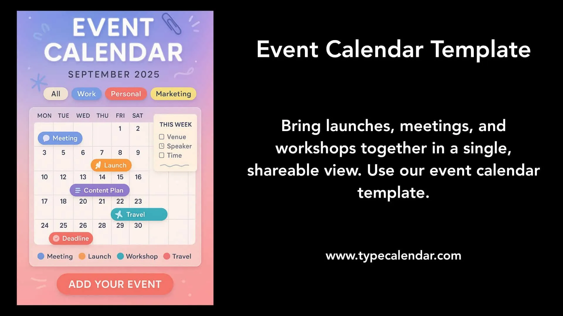When meeting notes, emails and announcements lost in post-its come together on a single page, team rhythm becomes clear and engagement increases. That’s why TypeCalendar prepared 35+ Event Calendar templates for use cases from campus events to brand launches, from content plans to association calendars. Choose a blank Event Calendar with a monthly view, or a blank Event Calendar that offers empty space line by line for busy week-based schedules, the goal is the same: to bring dates and deadlines to your attention.
